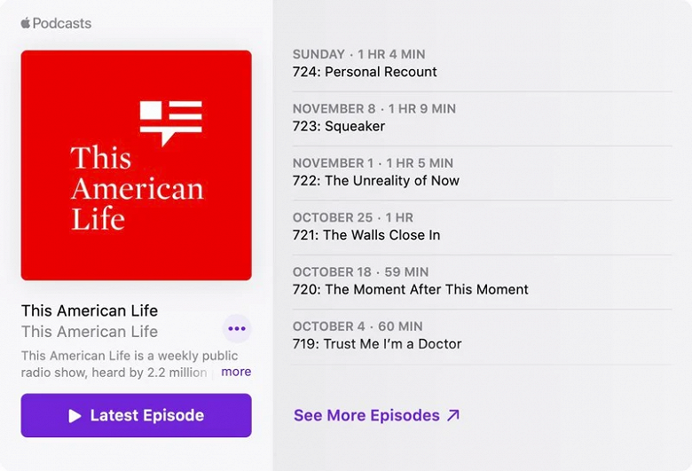 Встроенный плеер позволяет запустить прямо на сайте воспроизведение или открыть подкаст в приложении Podcasts на iPhone, iPad или компьютере Apple.