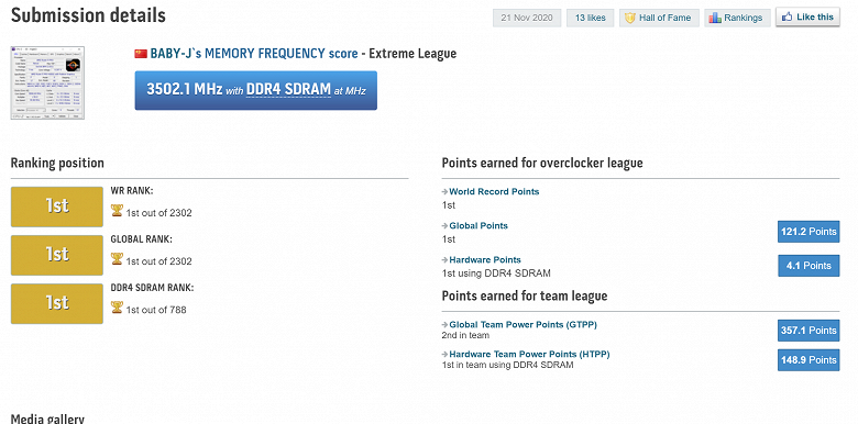 Как пишет источник, оверклокеру из Китая под ником Baby-Y удалось установить мировой рекорд разгона оперативной памяти: ее эффективная частота составила 7004 МГц (3502,1 МГц). Предыдущий рекорд – 6666 МГц.