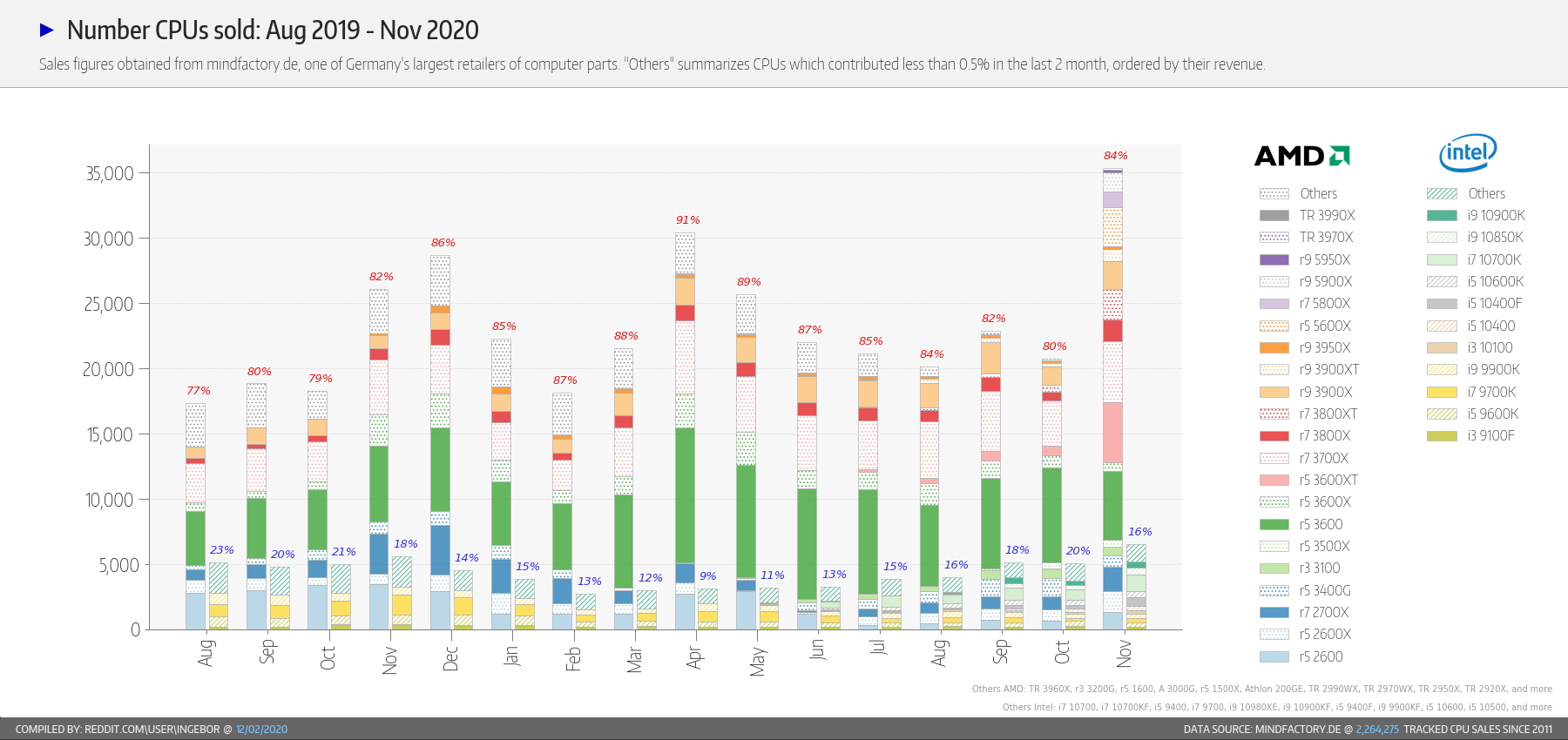 В ноябре на рынок вышли процессоры Ryzen 5000, и это не могло не отразиться на продажах на рынке ПК. Какой-то обобщающей статистики пока нет, но зато есть данные о продажах крупнейшего немецкого магазина Mindfactory по итогам ноября.