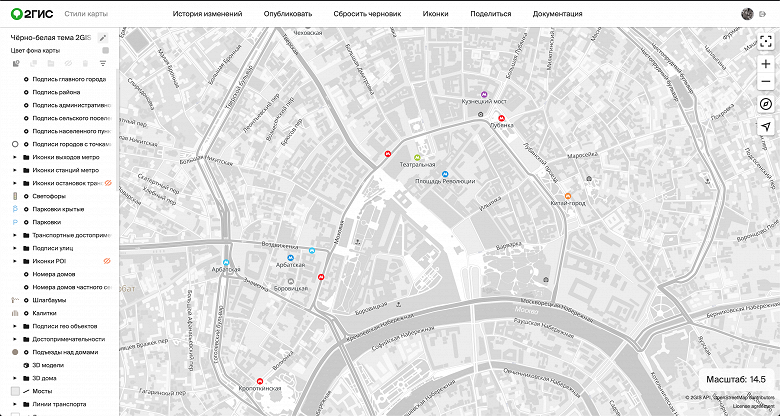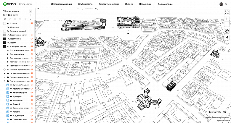 Ночная тема Как отмечают разработчики, 2ГИС первыми из российских картографических компаний представил инструмент для настройки внешнего вида 3D-карт. Инструмент уже доступен на странице styles.2gis.com. С помощью редактора стилей можно настроить внешний вид всех объектов на карте: изменить цвет зданий, установить толщину дорог или добавить свои значки.