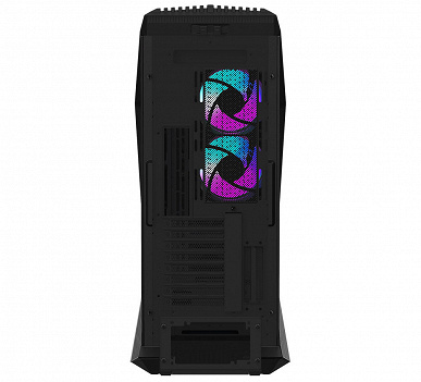 Дело в том, что дизайнеры не стали ограничивать себя требованием оптимального использования пространства. Шасси для системной платы и других компонентов повернуто под небольшим углом, что хорошо заметно на виде сбоку. Сверху и спереди выступают внушительные декоративные элементы из пластика и матового черного алюминия, украшенные адресуемой подсветкой. Боковая панель корпуса изготовлена из стекла.