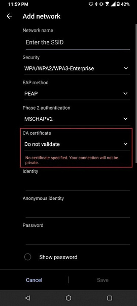 Было «Пострадавшие» смартфоны отказываются подключаться к некоторым корпоративным сетям. Проблема в том, что в настройках сети пропала опция Do Not Validate в разделе CA certificate. Ранее она появлялась, когда добавлялась новая сеть с WPA2-Enterprise.