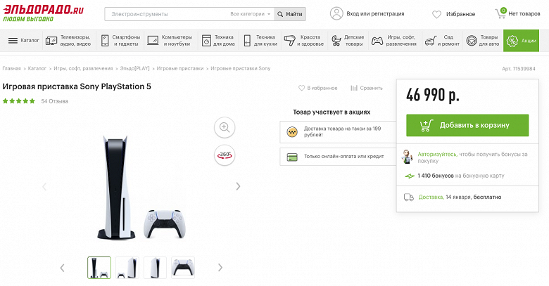 На момент написания новости в «Эльдорадо» можно купить стандартную версию Sony PlayStation 5. Купить приставку можно исключительно при условии оплаты онлайн на сайте. Цена тоже осталась стандартной — 46 990 рублей. Версия Digital Edition без оптического привода не предлагается. Можно с уверенностью сказать, что все доступные Sony PlayStation 5 разлетятся как горячие пирожки.