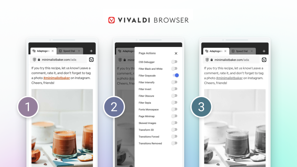 В Vivaldi 3.6 для Android появилась функция под названием Page Actions (Эффекты страницы). По словам разработчиков, это набор JavaScript, который позволяет «на лету менять отображение просматриваемых веб-страниц или добавлять к ним полезные элементы».