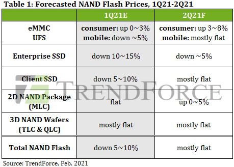 Согласно последним исследованиям TrendForce, спрос на флэш-память NAND продолжает расти, поскольку высокие продажи портативных компьютеров побуждают производителей ПК размещать дополнительные заказы на клиентские твердотельные накопители . Кроме того, запасы флеш-памяти NAND уже значительно сократились из-за агрессивной деятельности по закупкам некоторых брендов смартфонов. Ожидается, что заказчики в сегменте центров обработки данных увеличат закупки во втором квартале, а поставщики флэш-памяти NAND тем временем решили сократить поставки пластин. В результате всех этих факторов снижение контрактных цен на пластины замедлялось в течение последних двух месяцев, то есть в декабре прошлого года и январе этого года.