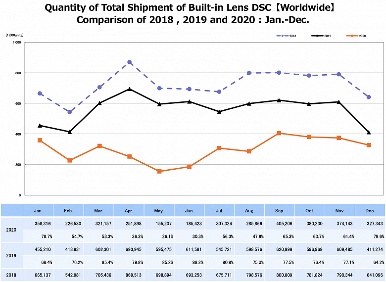 Компактных камер в декабре было продано 327 343 штуки — на 20,4% меньше в годовом выражении. Всего за 2020 год таких камер было продано 3 578 643 штуки, что на 47% меньше показателя за 2019 год. В денежном выражении продажи сократились на 41,3%.