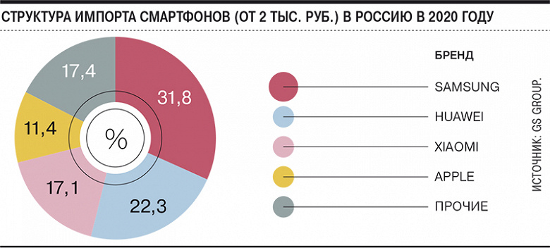 По данным GS Group, в 2020 году доля импорта смартфонов в Россию Huawei, Xiaomi, Oppo, Vivo и Realme составила 47%. Если же США продолжит вводить жёсткие санкции против китайских производителей, то доля этих брендов сократится в 2021 году до 25%.
