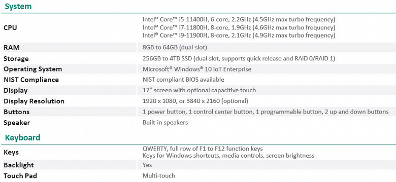 В сети обнаружено техническое описание компьютера на процессорах серии Tiger Lake-H. Он работает под управлением Windows 10 IoT Enterprise. Оснащение включает 17-дюймовый дисплей, опционально — сенсорный. Разрешение дисплея может быть Full HD (1920 х 1080 пикселей) или 4K (3840 х 2160).