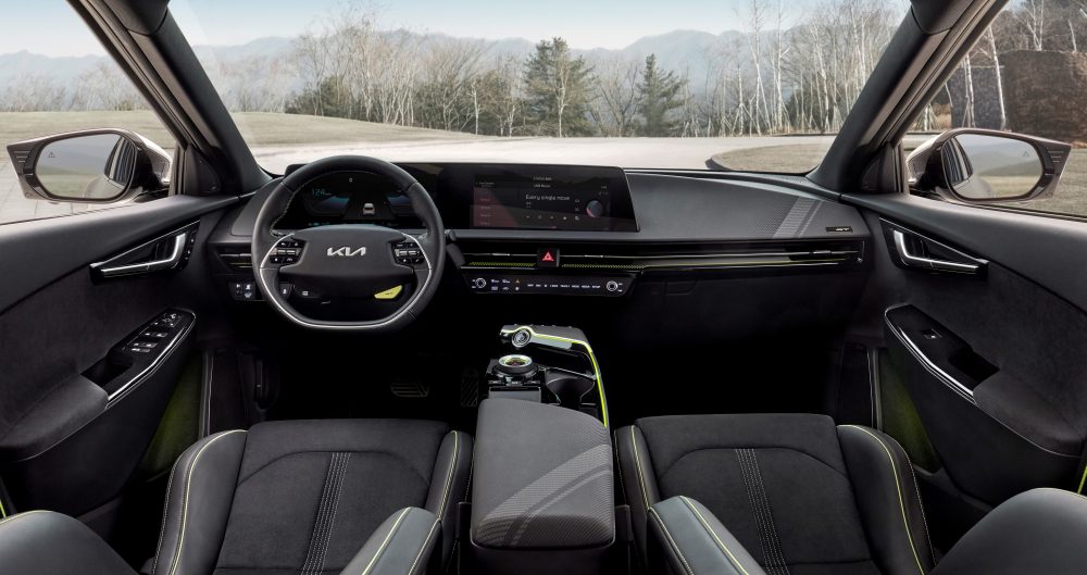 Также Kia показала интерьер новинки, в котором, например, панорамная передняя панель с двумя изогнутыми дисплеями диагональю 12,3 дюйма, проекция на лобовое стекло, сиденья из переработанного мусора и с отделкой искусственной кожей (все в угоду экологичности). Само собой, предусмотрены различные системы помощи при вождении.