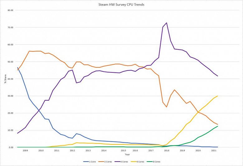 Как оказалось, 2021 год стал поворотным моментом для восьмиядерных процессоров – их доля уже практически сравнялась с долей двухъядерных. То есть «древние» игровые компьютерные системы все активнее уступают место куда более современным. Однако еще больше пользователей отдает предпочтение шестиядерным ПК – за три года их доля увеличилась до 30% с, практически, нуля.