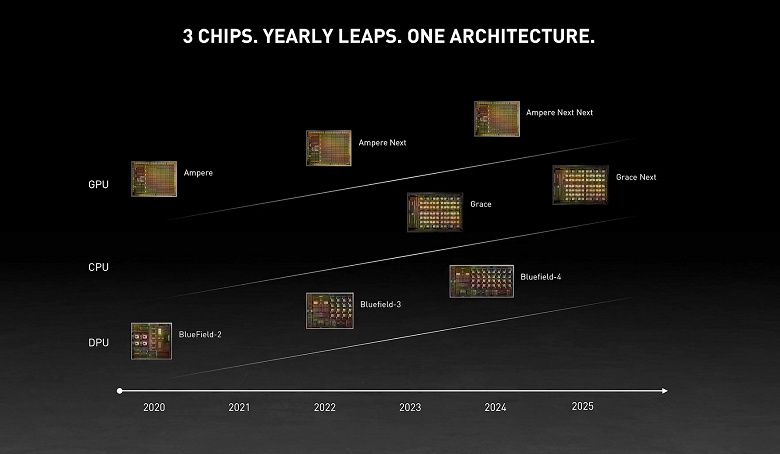 Как можно видеть, речь касается GPU, CPU и DPU (Data Processing Unit) для ЦОД. Последние представляют специфический продукт, поэтому лишь отметим, что следующее поколение выйдет в 2022 году, а Bluefield-4 ожидается в 2024 году.