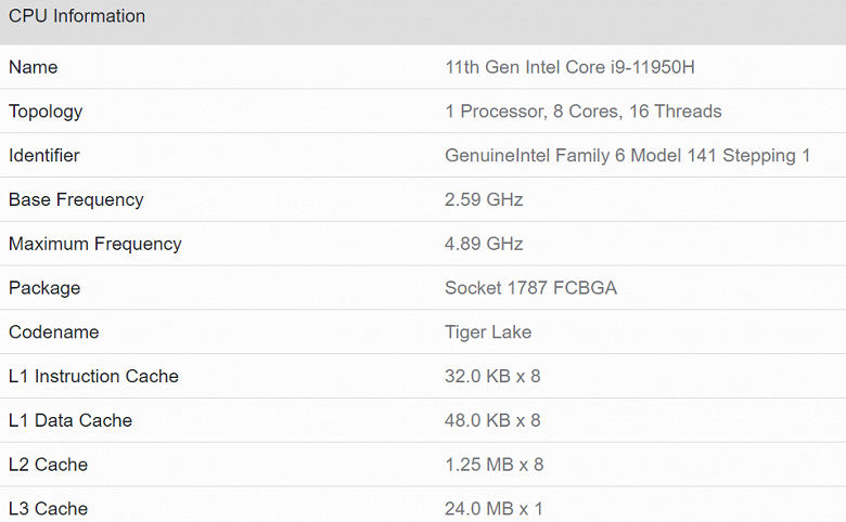Пока ещё не представленный процессор Core i9-11950H, как считается, будет одним из флагманов линейки Tiger Lake в целом и Tiger Lake-H45 в частности.