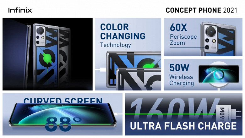 Infinix Concept Phone 2021 получил технологию сверхбыстрой проводной зарядки 160 Вт и поддержку беспроводной зарядки мощностью 50 Вт. Также реализованы различные механизмы защиты от перепадов напряжения, перегрева и так далее. 160-ваттная зарядка позволяет зарядить аккумулятор ёмкостью 4000 мА•ч за 10 минут.