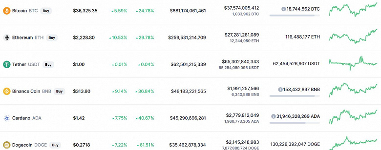 В итоге Bitcoin преодолела отметку в 36 000 долларов, Ethereum дорожает до 2200 долларов. Остальные криптовалюты из Топ-10 тоже в плюсе, а наибольший недельный рост демонстрирует Dogecoin – почти 60%. Впрочем, она же была и в лидерах падения прошлых недель.
