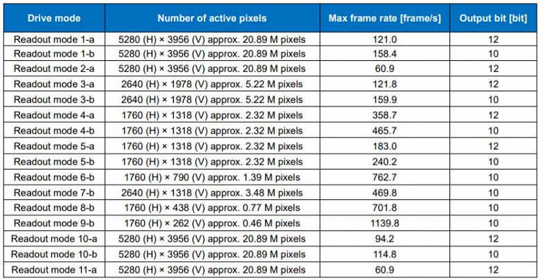 Так, в полном разрешении 5280 х 3956 пикселей с 12-битным представлением можно снимать с частотой 121 к/с. Выбрав 10-разрядное представление, можно повысить частоту до 158,4 к/с. При уменьшении разрешения тоже можно повысить частоту. Так, при съемке с разрешением 1760 х 1318 пикселей можно рассчитывать не частоты 358,7 к/с и 465,7 к/с при 12-битном и 10-битном представлении данных соответственно. Полностью таблица режимов чтения приведена ниже: