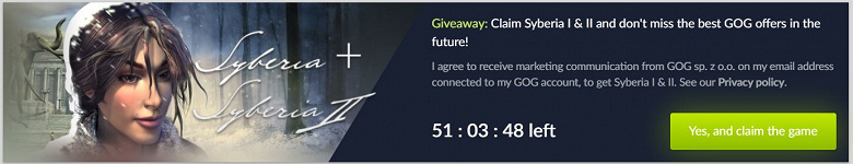 Предложение действует до 13:00 по всемирному координированному времени 17 июля 2021 года. Чтобы им воспользоваться, надо перейти на главную страницу GOG.COM и запросить игру, согласившись на получение рекламы на адрес электронной почты, связанный с учетной записью в GOG.