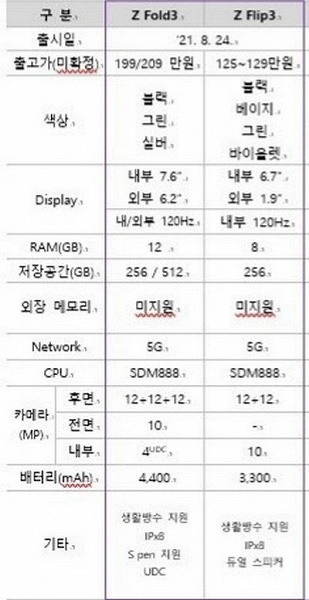 В Сети появилась табличка с подробными характеристиками как Galaxy Z Fold3, так и Galaxy Z Flip3. К параметрам мы вернёмся позже, сейчас же остановимся на фронтальной камере. Если верить этим данным, её разрешение составит всего 4 Мп! Для сравнения, у Fold2 разрешение 10 Мп.