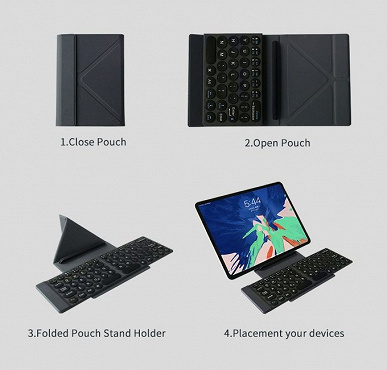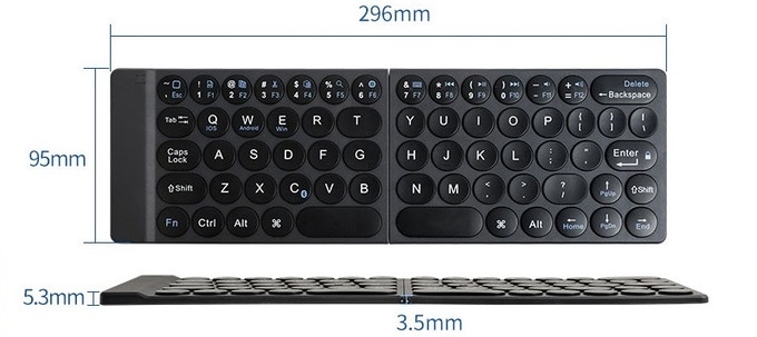 Как утверждается, магнитное соединение в месте сгиба выдерживает «миллионы» складываний-раскладываний без какого-либо износа. Раскладка включает 65 клавиш, за которыми закреплено 120 функций. Вогнутая форма колпачков обеспечивает удобство и высокую скорость работы. Клавиатура комплектуется чехлом, который можно использовать как подставку для мобильного устройства. На одной зарядке аккумулятора клавиатура может продержаться в режиме ожидания до 12 дней. Для зарядки используется разъем USB-C. Кабель с разъемами USB-A и USB-С входит в комплект.