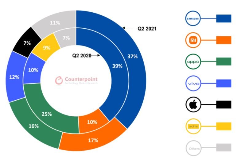 Компания Samsung заняла первое место на рынке с долей 37%, чему способствовал успех моделей Galaxy M31, Galaxy A12 и Galaxy A02s. Компания Xiaomi заняла второе место с 17%, успешно продвигая серии Redmi 9 и Note 10. На третьем и четвертом местах находятся Oppo и vivo. Компания Apple по итогам квартала заняла 7% рынка, что соответствует пятому месту.