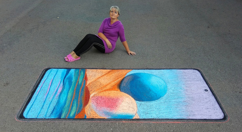 Елена Николаева нарисовала на асфальте огромный Redmi Note 10 Pro. Отмечается, что на рисунок трёхметрового смартфона у неё ушло 8 часов без перерывов.