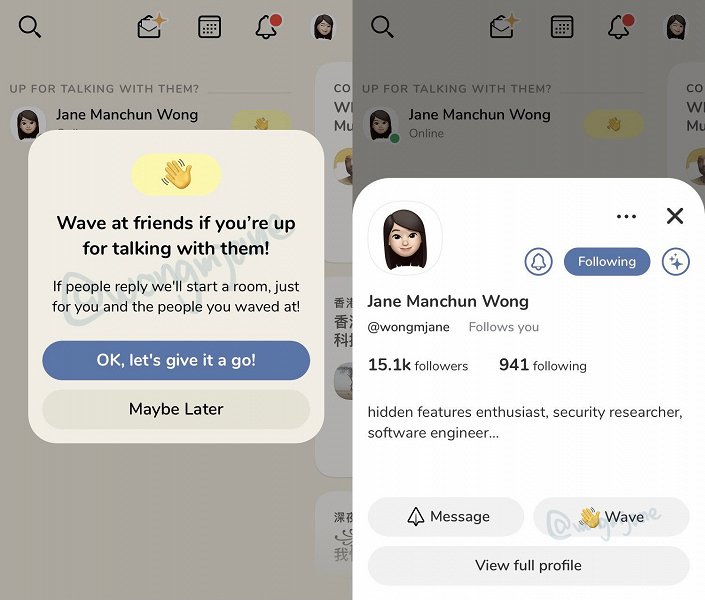 Сейчас функция называется Wave, но к релизу название может измениться. Её обнаружили в недрах кода приложения. Когда функция появится в Clubhouse, она будет доступна в виде кнопки, похоже на кнопку Wave, которую пользователи видят, когда впервые подключается к кому-то Messenger.