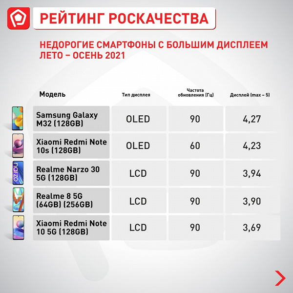 Единственным исключением стала категория недорогих смартфонов с большим экраном — здесь первое место занял смартфон Samsung Galaxy M32, а Redmi Note 10s занимает почётное второе место.