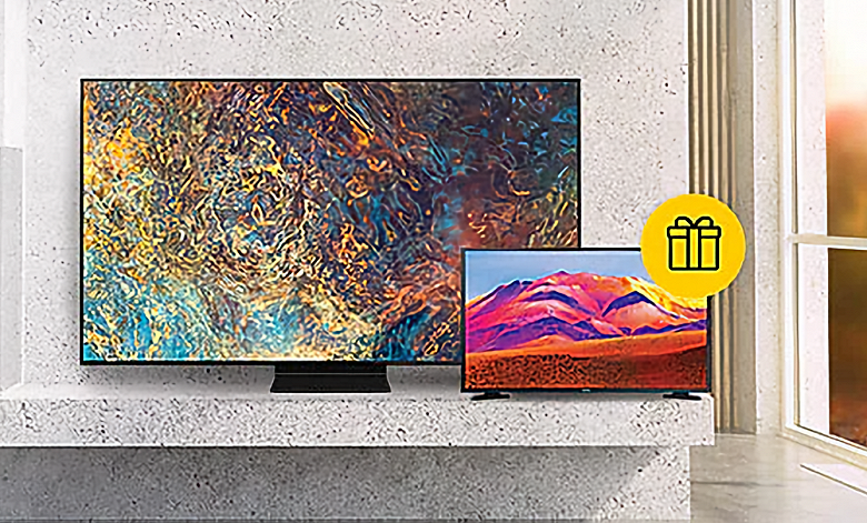 Например, при покупке 75-дюймового QN87A Neo QLED 4K Smart TV 2021 за 279 990 рублей предлагается 43-дюймовый Crystal UHD 4K Smart TV AU9010 Series 9 (UE43AU9010UXRU), который отдельно стоит 46 990 рублей. За 85-дюймовый QN85A Neo QLED 4K Smart TV 2021 (399 990 рублей) покупатель получит 55-дюймовый Q60A QLED 4K Smart TV 2021 (QE55Q60AAUXRU), который отдельно стоит 79 990 рублей, а если купить 85-дюймовый QN900A Neo QLED 8K Smart TV 2021 за 859 200 рублей, то можно получить 75-дюймовый Q60A QLED 4K Smart TV 2021 за 159 990 рублей.