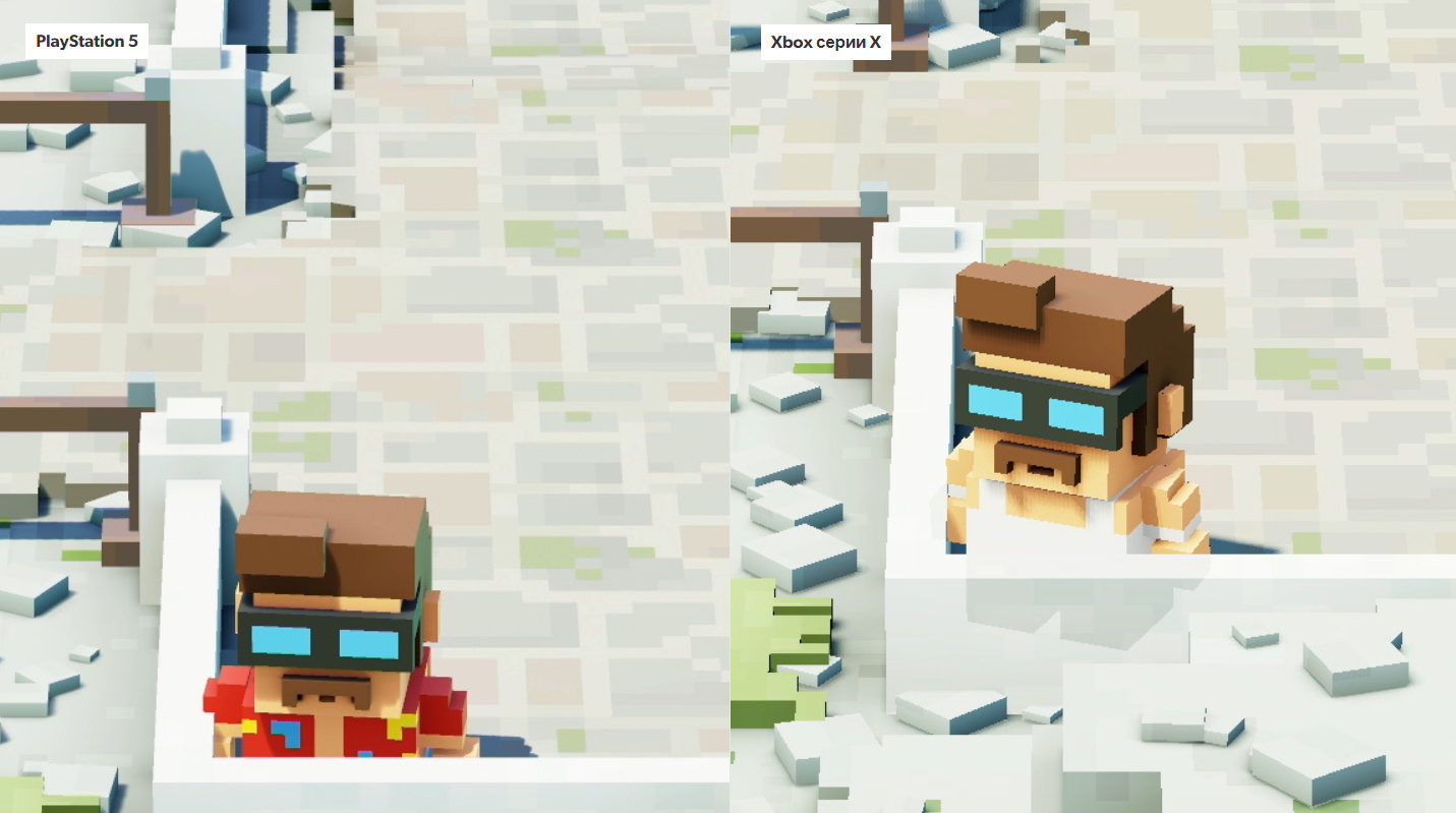 Что касается в целом таких впечатляющих возможностей обеих консолей в этой игре, тут всё объясняется её малой ресурсоёмкостью, обусловленной воксельной графикой.