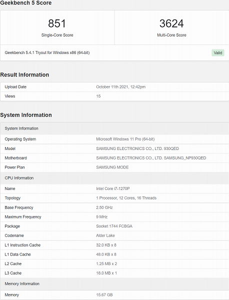 Мобильный ПК Samsung Galaxy Book засветился в базе Geekbench с неанонсированным 12-ядерным процессором Intel поколения Alder Lake.