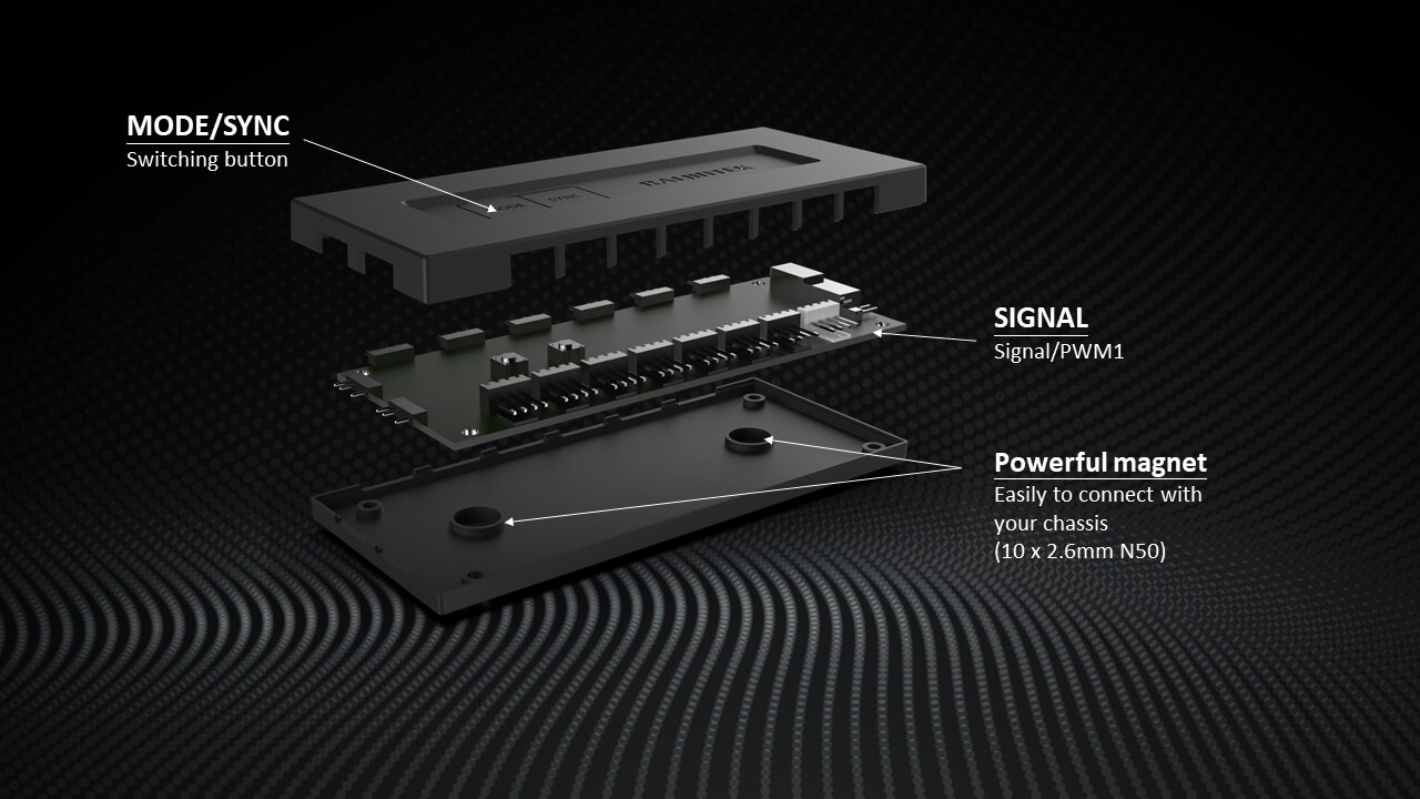 Компания Raijintek представила концентратор RJK 5V DRGB-PWM, который позволяет управлять вентиляторами, поддерживающими изменение скорости с помощью ШИМ, и элементами адресуемой подсветки. На один вход концентратора подается сигнал ШИМ, на второй — сигнал для управления ARGB с системной платы. Выходных разъемов ШИМ — восемь, ARGB — столько же. Для подачи питания используется один разъем питания SATA.