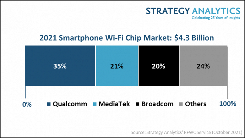 Qualcomm по итогам 2021 года займет 35% рынка микросхем Wi-Fi для смартфонов