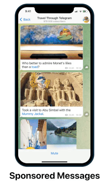 Рекламные сообщения, или Sponsored messages, в Telegram отображаются в крупных общедоступных каналах формата one-to-many (один ко многим), у которых имеется более чем 1000 подписчиков. Рекламные сообщения ограничены 160 символами. Как обещает команда Telegram, рекламные сообщения основаны исключительно на теме общедоступных каналов, в которых они отображаются.