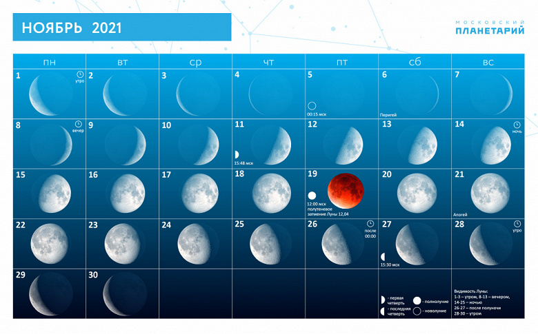 Затмение произойдёт 19 ноября. В этот день в тень Земли в 12:04 по московскому времени погрузится 0,97 лунного диска.
