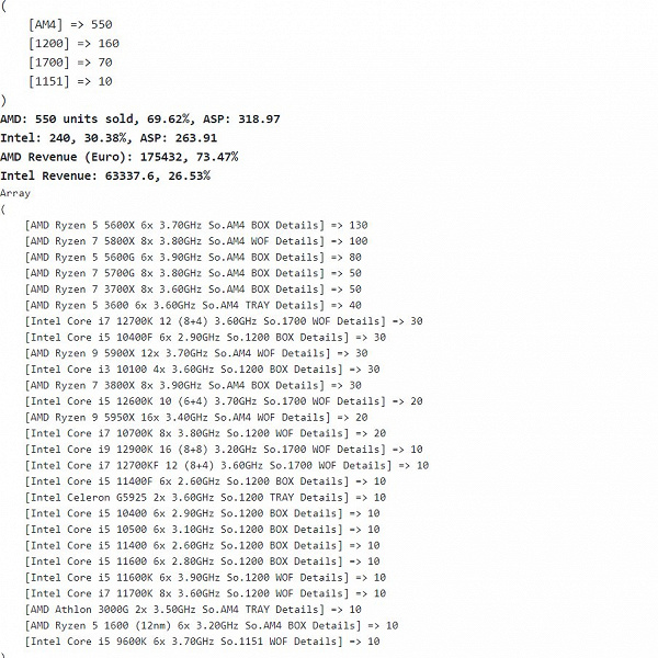 Интересно, что лучшим процессором Intel за неделю продаж стал представитель новейшей линейки Alder Lake – 12-ядерный Core i7-12700K. Но количественно этих процессоров продано столько же, сколько и прямого конкурента – 12-ядерного Ryzen 9 5900X. Возможно, за вторую неделю продаж Alder Lake нарастят свои позиции, но в топ-5, оккупированный CPU AMD, им вряд ли получится пробиться.