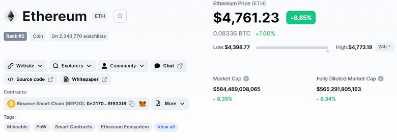 Ethereum в шаге от рекорда стоимости. За сутки криптовалюта подорожала на 8,5%