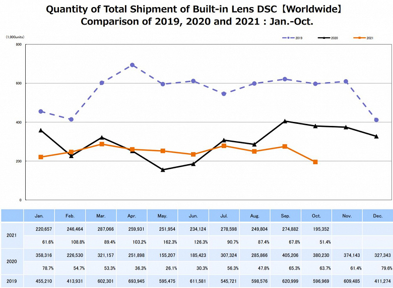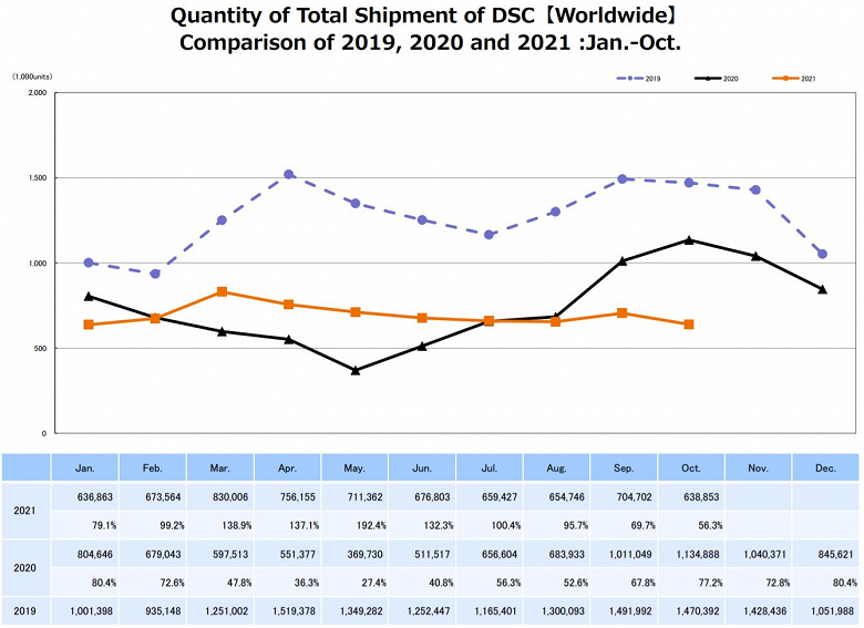 Что касается октября, за месяц было продано 638 853 камеры, что составляет всего 56,3% от уровня, достигнутого в октябре прошлого года, когда было продано 1 134 888 камер.