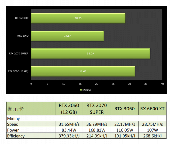 Но самое интересное то, что RTX 2060 в своём обновлённом облике, само собой, не имеет никаких механизмов защиты от майнинга, так что её производительность превышает возможности RTX 3060, достигая примерно 31–32 MH/s. В итоге это чуть ли не лучшее предложение для майнеров и далеко не лучшее для геймеров.