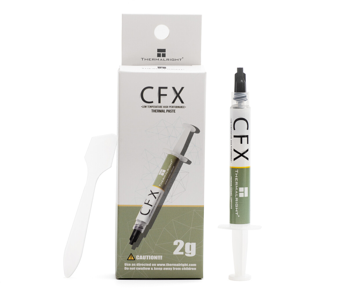 Компания Thermalright представила термопасту CFX. Эта паста работает в широком диапазоне — от -50°C до 150°C. Её теплопроводность составляет 12 Вт/мК, тепловое сопротивление — 0,009°C-см²/Вт, относительная плотность — 2,3 (при температуре 25°C). Производитель не раскрывает состав термопасты, ограничиваясь утверждением, что она не проводит электричество.