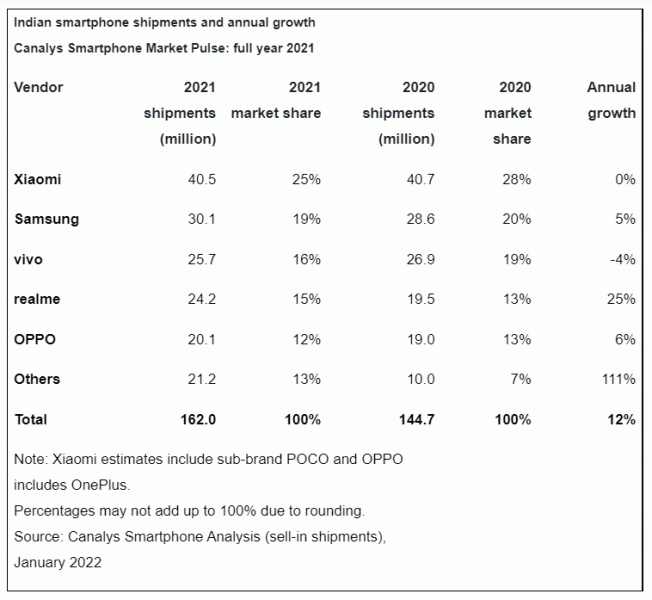 Аналитики Canalys оценили рынок смартфонов Индии по итогам всего 2021 года. Поставки в прошлом году выросли на 12%, до 162 млн аппаратов.