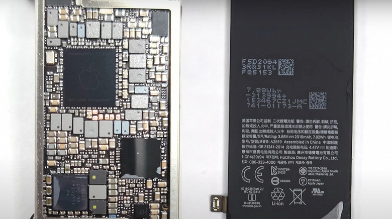 Слева – системная плата нового iPhone SE, справа – аккумуляторная батарея Разборка наконец-то дала ответ на параметры аккумуляторной батареи нового iPhone SE. Ее емкость составила 2018 мА·ч (7,82 Вт·ч). Для сравнения, емкость аккумуляторной батареи iPhone SE 2020 – 1821 мАч. Это залог повышенной автономности нового iPhone SE относительно предшественника.