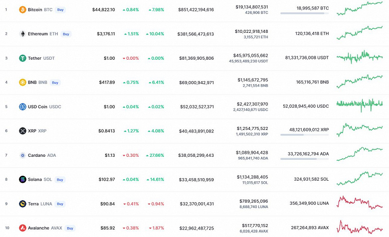 Вторая криптовалюта мира, Ethereum, прибавила даже чуть больше – 10%: стоимость 1 ETH – около 3170 долларов. Но куда больший плюс у Cardano: за неделю ее цена взлетела на 27%. Все это привело к тому, что капитализация рынка вновь превысила отметку в 2 триллиона долларов.