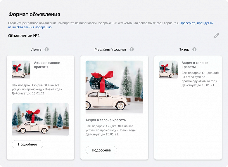 Большая часть настроек заполняется автоматически исходя из задач конкретного бизнеса. В сервисе есть библиотека готовых шаблонов изображений и текстов для создания рекламных объявлений под разные типы бизнеса и виды акций. Кроме того, СберТаргет проверяет объявления на соответствие требованиям рекламных площадок.