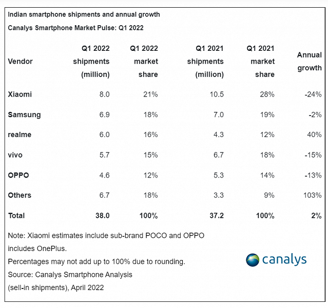 В первом квартале продажи Realme за год выросли с 4,3 до 6 млн, тогда как продажи Samsung упали с 7 до 6,9 млн. В итоге первая занимает 16% рынка, а у второй сейчас 18% рынка. Xiaomi с её 8 млн проданных смартфонов удерживает 21%, хотя годом ранее она реализовала 10,5 млн аппаратов, так что по факту спад продаж у Xiaomi намного больше, чем у Samsung.