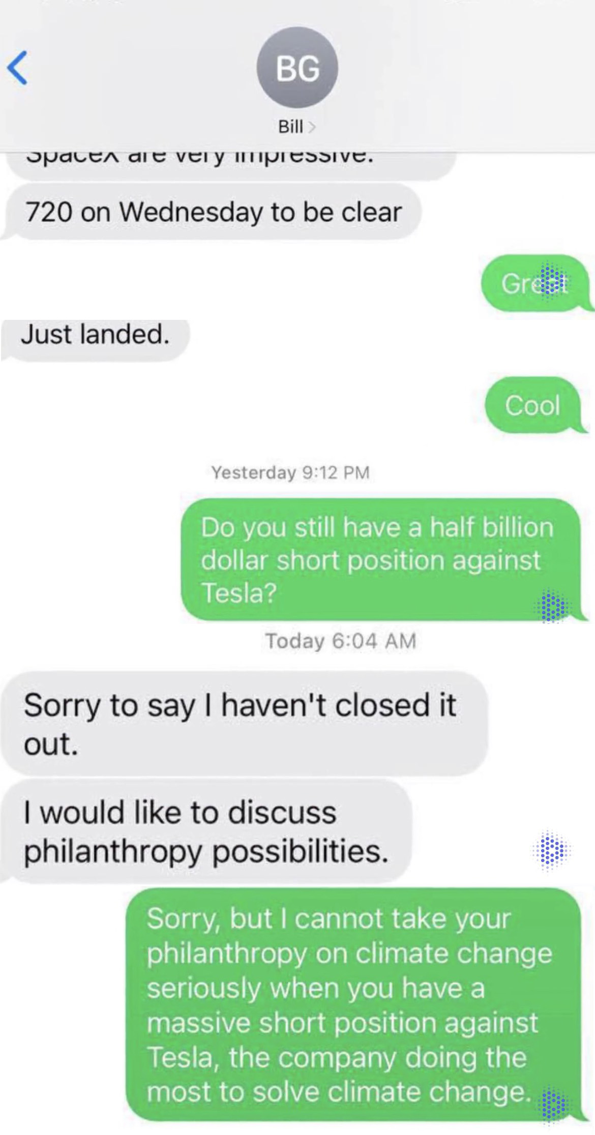 Причина обращения Гейтса к Маску оказалось вполне себе благородной – он хотел обсудить благотворительность в насущных вопросах изменения климата. Судя по скриншотам, Маск поначалу был не против встречи, но потом он спросил у Гейтса о его коротких позициях в Tesla на полмиллиарда долларов. И тот признал, что действительно не закрыл их. На что Маск ответил следующее: