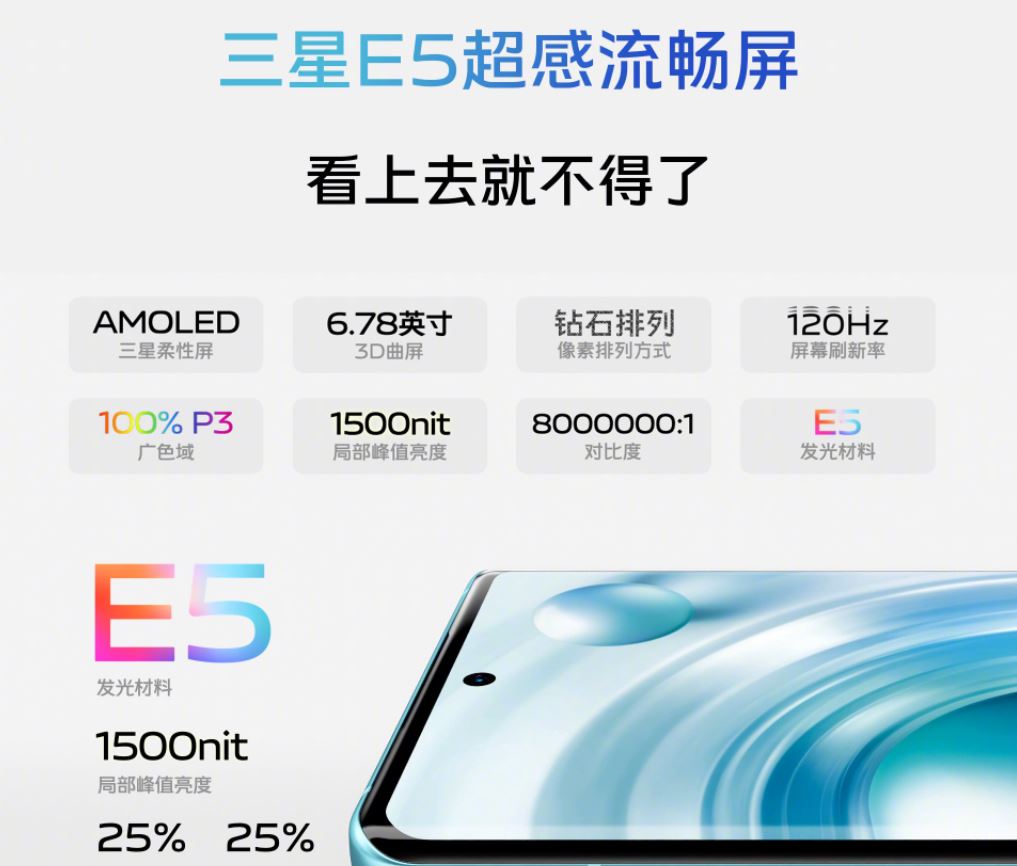 Vivo X80 оснащен экраном AMOLED Samsung E5 с диагональю 6,78 дюйма, разрешением Full HD+, кадровой частотой 120 Гц, охватом 100% цветового пространства DCI-P3 и пиковой яркостью 1500 кд/кв.м.