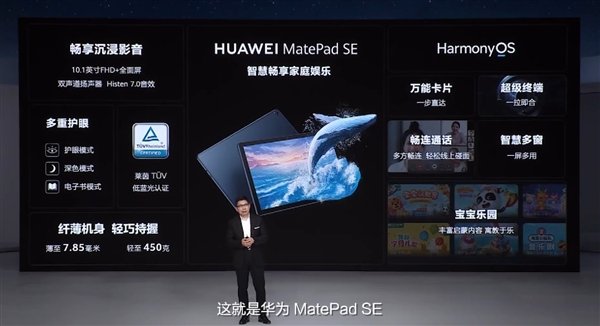 Huawei MatePad SE ориентирован на нетребовательных пользователей и детей. Планшет базируется на SoC Kirin 710A, в качестве программной платформы выступает фирменный заменитель Android – HarmonyOS 2. Диагональ экрана IPS – 10,1 дюйма, разрешение – Full HD+. В конфигурацию планшета входит фронтальная 2-мегапиксельная и основная 5-мегапиксельная камеры, стереодинамики, аккумулятор емкостью 5100 мА·ч. Толщина устройства составляет 7,85 мм, масса – 450 граммов.