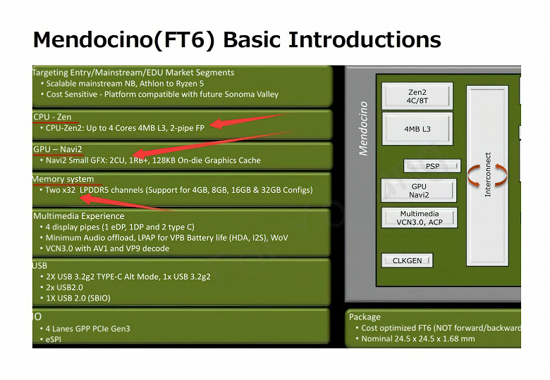 Что интересно, так это поддержка исключительно LPDDR5 (два канала), что положительно скажется на производительности в целом и iGPU в частности. А ещё сам APU будет очень компактный — всего 100 мм2. Из остального можно отметить поддержку декодирования AV1 и VP9.