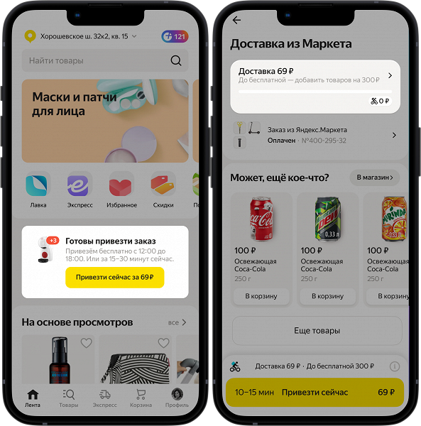 Доставка «по нажатию», выбранная уже после оформления покупки, стоит от 29 рублей в зависимости от региона. Если при её заказе добавить к посылке из «Маркета» продукты или готовую еду из «Лавки», то всё вместе приедет бесплатно.