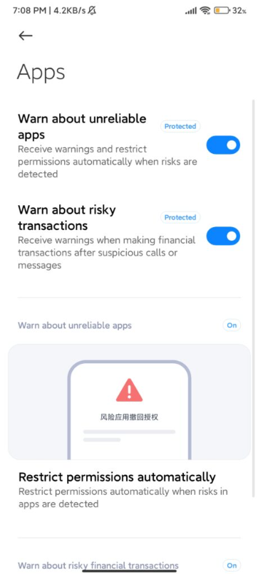 В MIUI 14 будет реализована защита от разного рода мошеннических действий на системном уровне – в звонках, сообщениях и приложениях. Например, она будет работать при поступлении звонков с неизвестных номеров и предупреждать пользователя о возможной опасности. Также телефон будет предупреждать, когда коды из SMS перенаправляются в социальные сети. Смартфон будет предупреждать о небезопасных финансовых транзакциях и т.д.