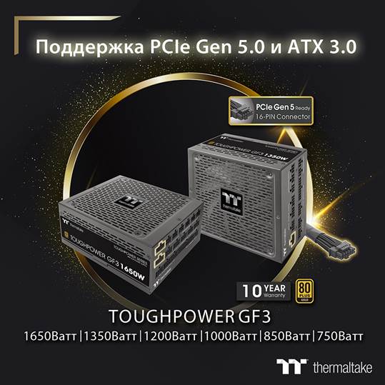 Полная совместимость с GeForce RTX 40. Представлены блоки питания Thermaltake Toughpower GF3 с поддержкой PCIe Gen 5.0 и ATX 3.0